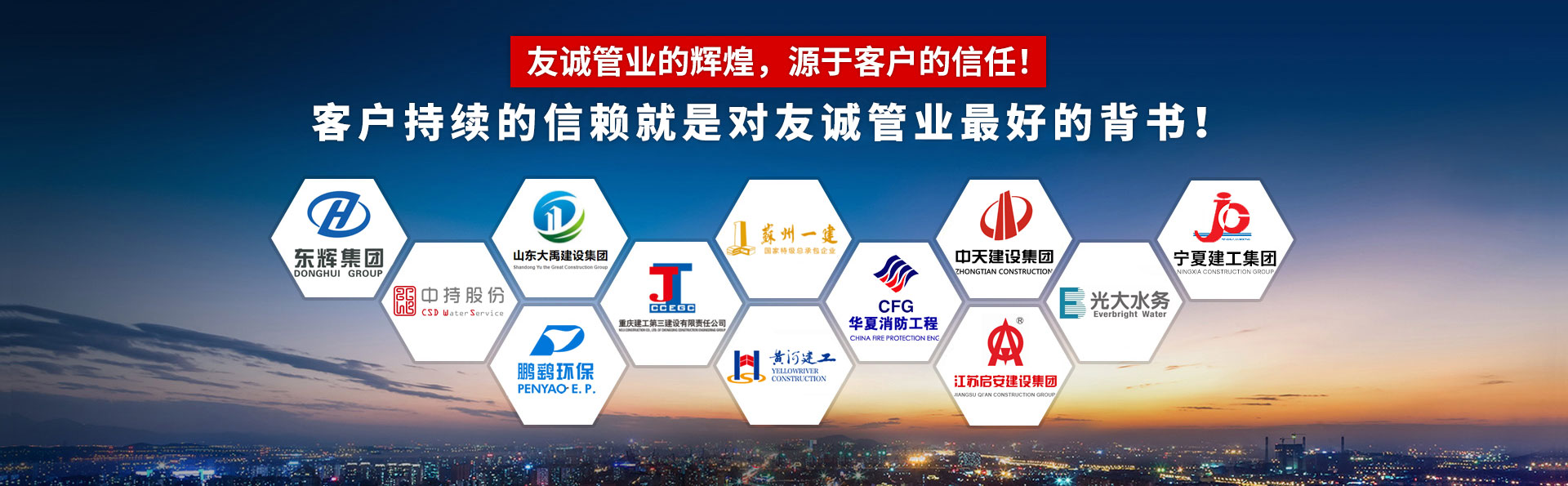 滄州友誠管業有限公司是一家專業從事生產防腐涂塑管道及管件于一體的大型企業。公司注冊資金8600萬元,位于中國管道生產基地—河北鹽山縣,近靠京滬高速、榮烏高速、黃石高速30公里,高鐵滄州西站40公里,天津國際機場、濟南遙墻機場150公里,為客戶來訪及業務發展提供了便利的交通條件。 鋼管系列:螺旋鋼管、無縫鋼管、ERW直縫焊管、JCOE埋弧焊直縫鋼管、熱鍍鋅鋼管。 涂塑系列:內外涂塑鋼管、涂塑復合鋼…… 了解更多